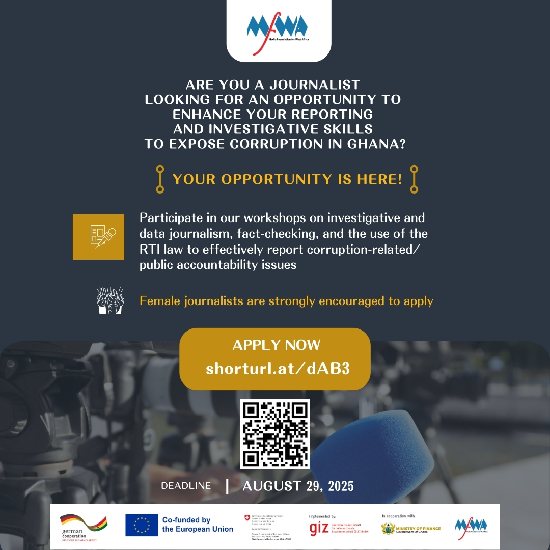 The Media Foundation for West Africa (MFWA), with funding from the German Development Cooperation is inviting applications from interested journalists in Ghana to participate in a series of three intensive capacity-building workshops on investigative journalism, data journalism, fact-checking, and the effective use of Ghana’s Right to Information (RTI) law.